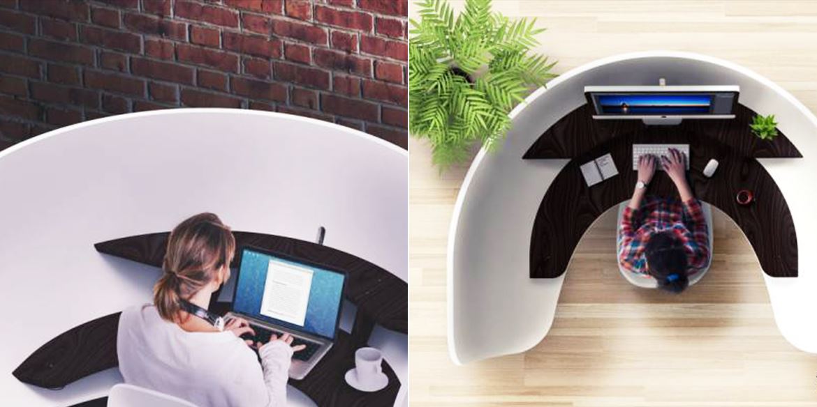 事實(shí)證明,公共辦公場所(圖書館、咖啡廳等)并不是那么的完美無缺。盡管它美觀、大方、敞亮,但辦公時難免會因?yàn)橥饨缫蛩兀ㄩ_門、他人電話等)而分心。于是,設(shè)計(jì)師們設(shè)想:采用何種改進(jìn)能夠幫助工作人員在公共場所專心辦公呢?可能你會想,他們一定會設(shè)計(jì)出一些非常高科技的產(chǎn)品,用高科技來屏蔽外界干擾,以達(dá)到預(yù)期的效果。然而事實(shí)并非如此,他們的做法很簡單,僅僅是通過縮減桌面面積來減少放置雜物的空間,同時加高桌子周圍的“墻”高度來減少外界對于用戶視覺的干擾。