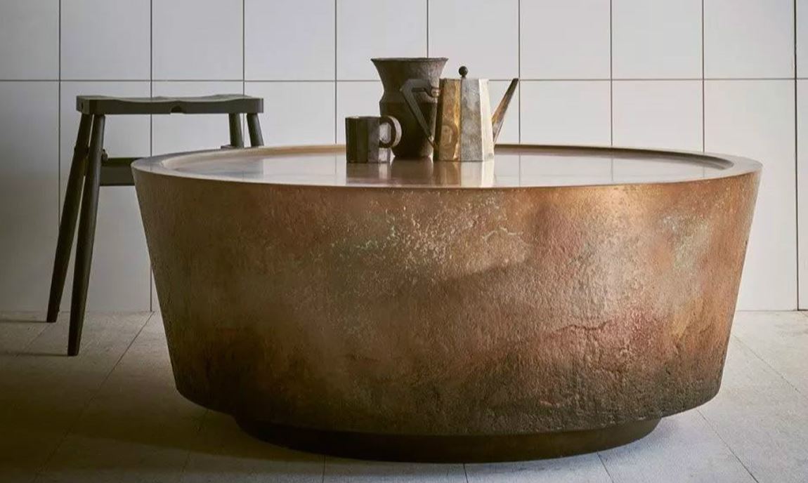 比如上圖,來自倫敦工作室推出的限量版Nim咖啡桌,將石膏和樹脂符合材料Jesmonite與銅粉混合在一起來創(chuàng)造金屬質(zhì)感。