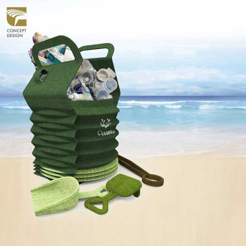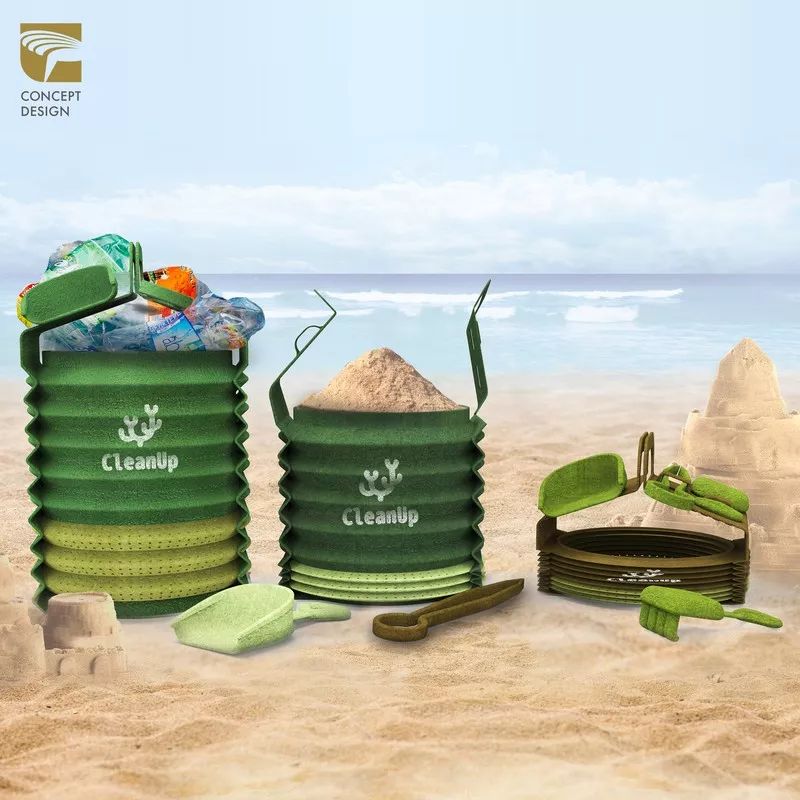這是一套沙灘玩具以及凈灘工具。采用海藻紙張制成,具有可自然分解的特性。